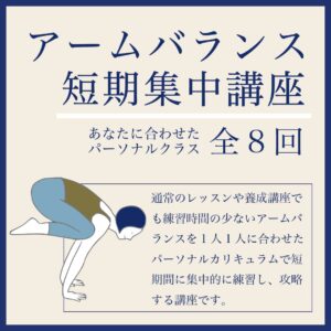 普段のクラスや養成講座でも練習時間の少ない「逆転のポーズ」を集中的に練習できる講座です。プライベートレッスン(1回60分)であなたに合わせた練習方法で全8回にわたって学ぶ、短期集中講座です。